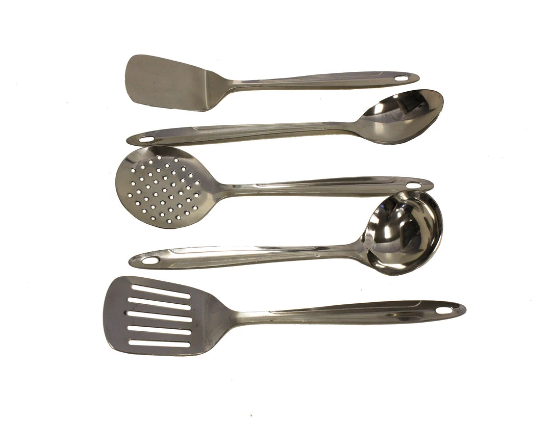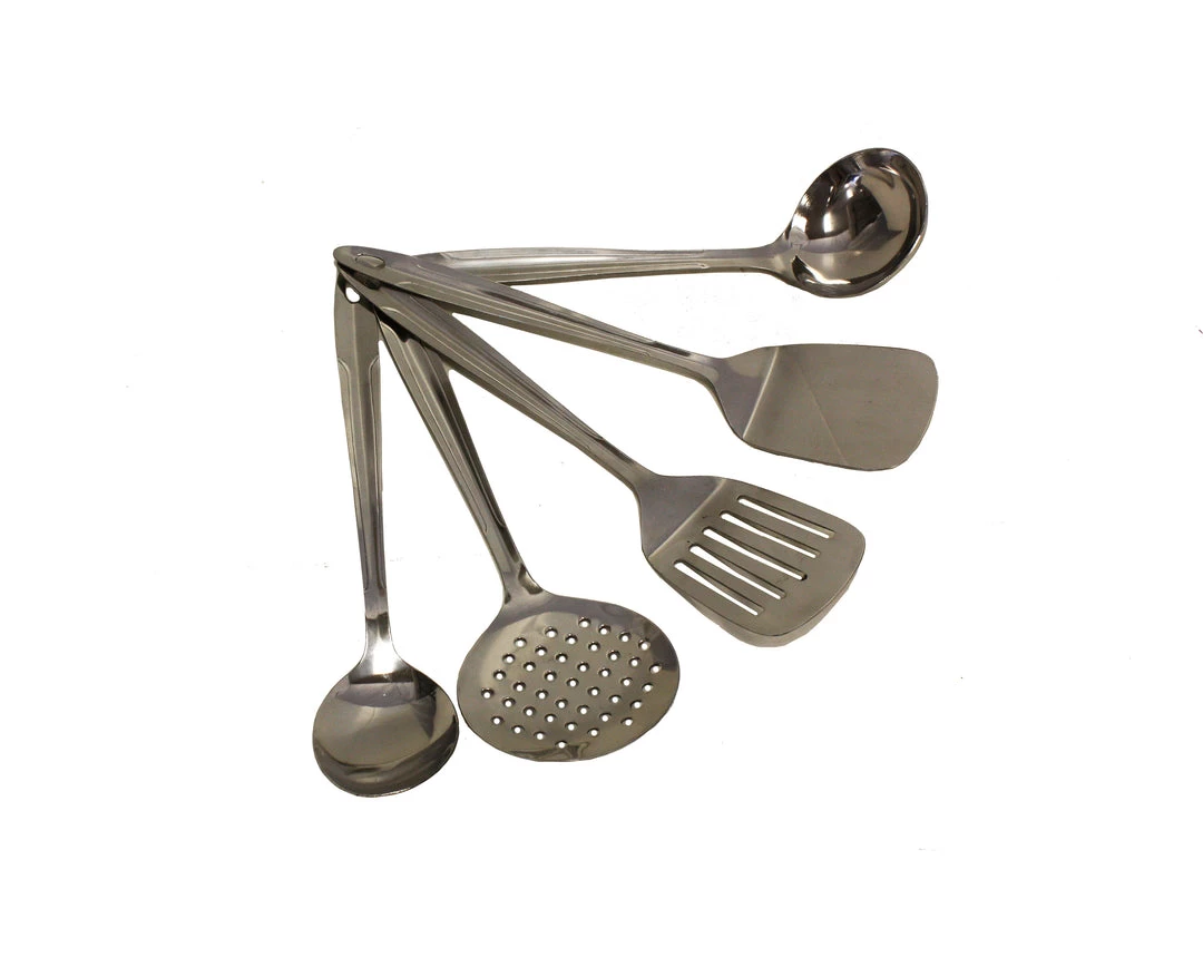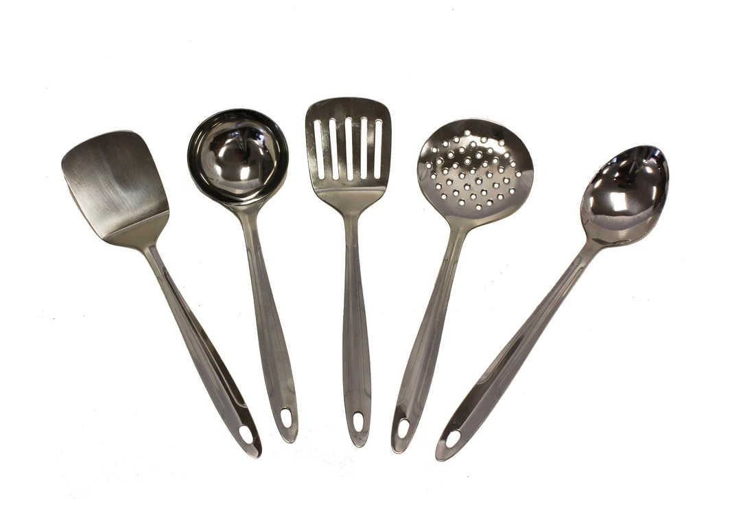 Bring modern style and elegance to your kitchen with this five piece set of stainless steel utensils. Each utensil is formed from one piece of solid steel and polished to a stainless, mirror-like shine. Utensils measure between 11″ and 13″ long and are 1/16″ thick.