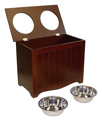This elegant serving box keeps your pet’s food and water at a comfortable height to prevent neck strain and promote healthier digestion. Lift the metal hinged top to store food, toys, and other supplies. This pet food server and storage box is made from durable MDF with a non-toxic finish and features two removable stainless steel bowls.