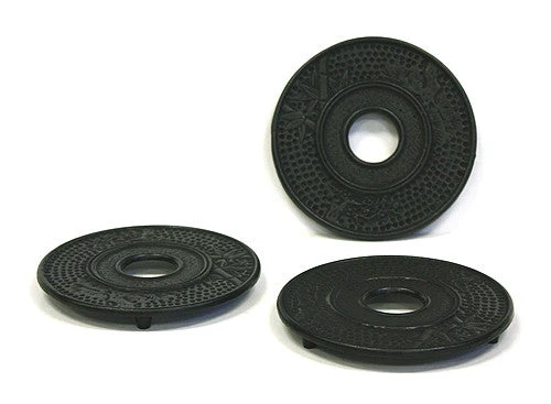 Protect your counters and fine furniture against heat damage with these handsome cast iron trivets. The hole in the center of each trivet allows air to circulate and disperse heat before causing damage to your counters and tabletops.