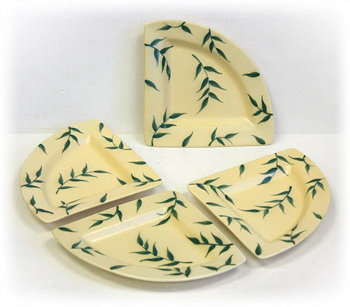 Beautiful four-piece plate set featuring scattered dark green, vine-like branches. Each item is hand-painted so there may be some shape and color variation in designs from piece to piece. Made with microwave and dishwasher safe ceramics.