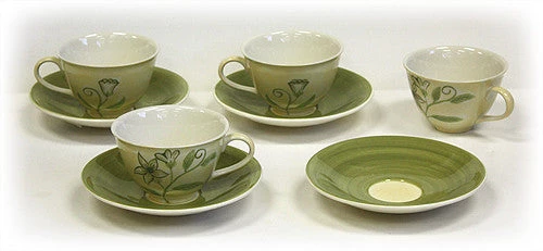 A finely crafted set of 4 cups and 4 matching saucers decorated with vine-like flowers against a pale yellow background. Each item is hand-painted so there may be some shape and color variation in designs from piece to piece.
