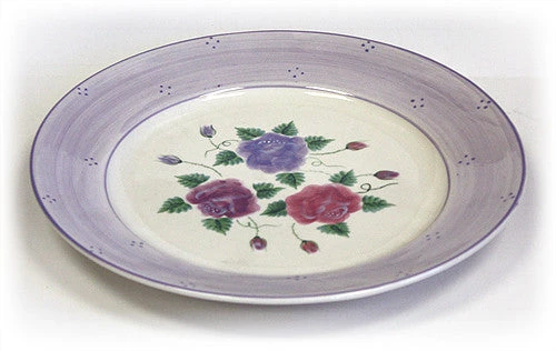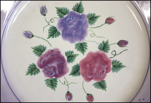Beautifully painted ceramic serving platter decorated with three colors of delicate roses and a pale lavender trim. Each plate is hand-painted so there may be some shape and color variation in designs from piece to piece.