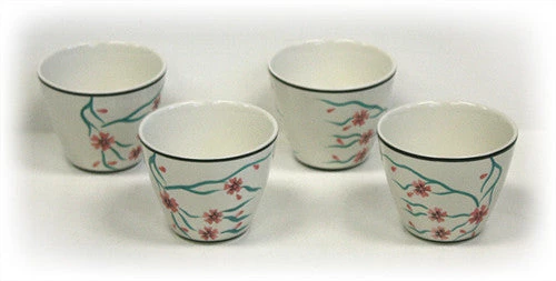 - Set of four small ceramic cups decorated with delicate pink flowers on sprawling branches
