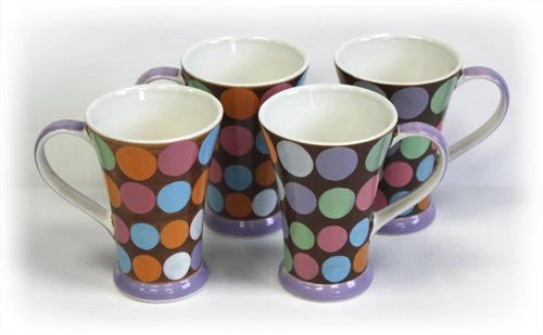Bring a splash of color to the world of coffee and tea with this four piece ceramic mug set. Each item is hand-painted so there may be some shape and color variation in designs from piece to piece.ย