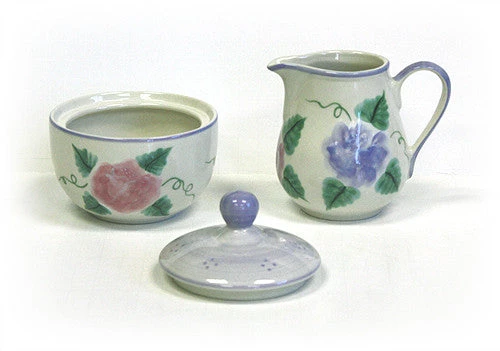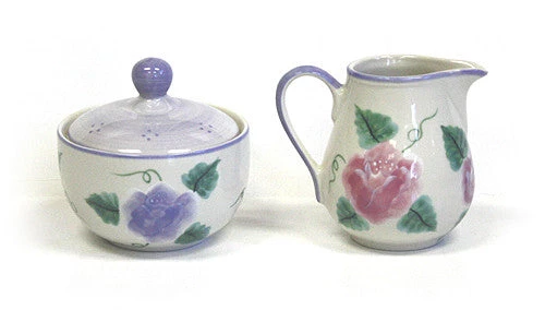 - Two-piece ceramic sugar and cream set decorated with pink and lavender roses