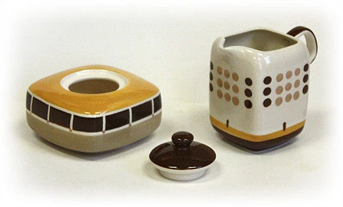 - Two-piece sugar and cream serving set decorated in rich caramel-colored patterns