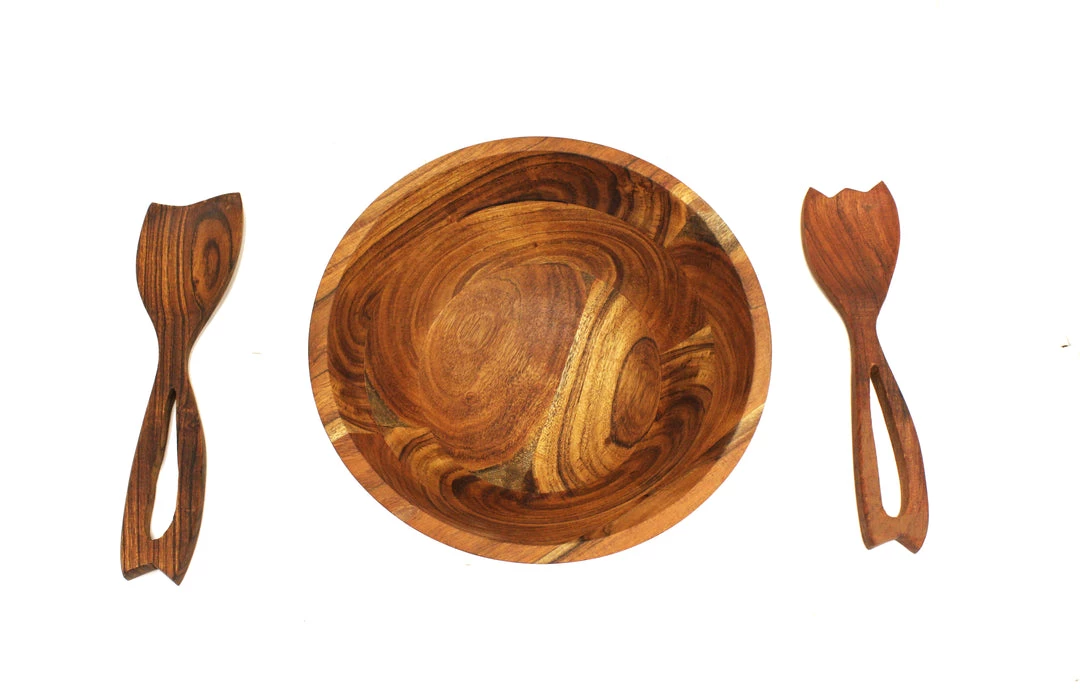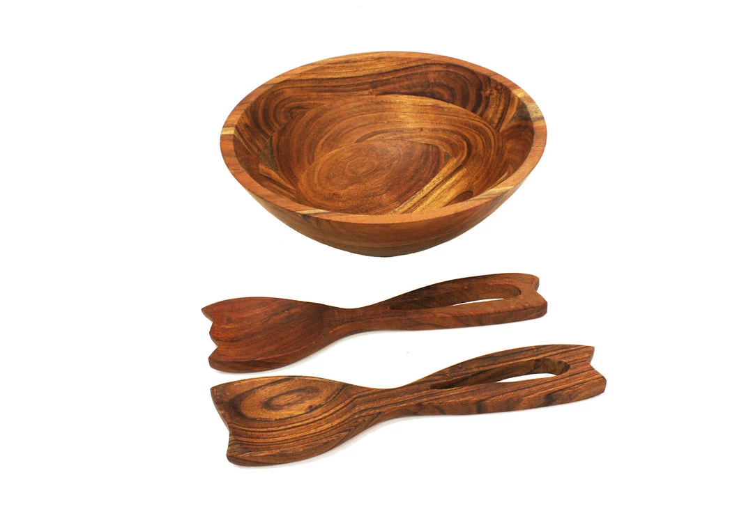 Serve up your favorite salads and side dishes in style with this three-piece bowl set handcrafted from acacia hardwood. The three-piece set includes one main server bowl and two utensils.