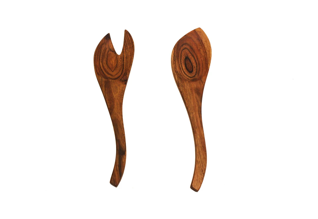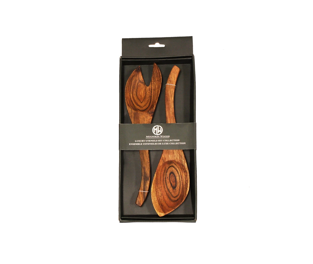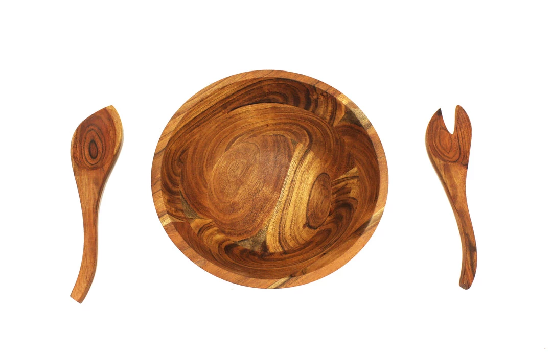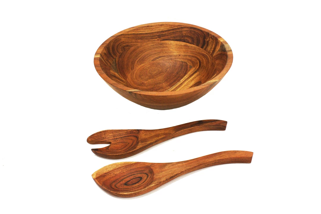Serve up your favorite salads and side dishes in style with this three-piece bowl set handcrafted from acacia hardwood. The three-piece set includes one main server bowl and two utensils.