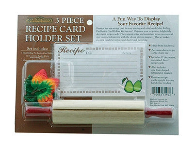 Shaped like a miniature rolling pin, this hardwood recipe cardholder is a fun way to keep your recipe cards in an upright position for easy reading. These handy little recipe cardholders are also great as party favors for dinners, weddings, and birthdays. Write out your favorite recipes on the delightfully decorated recipe cards and keep them for years to come. This three-piece set also includes a fun, fruit-shaped magnet for placing important notes and reminders on your refrigerator where they’re easy to read.