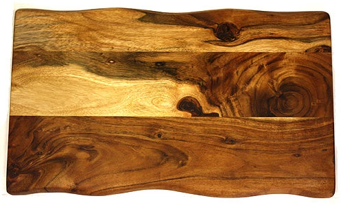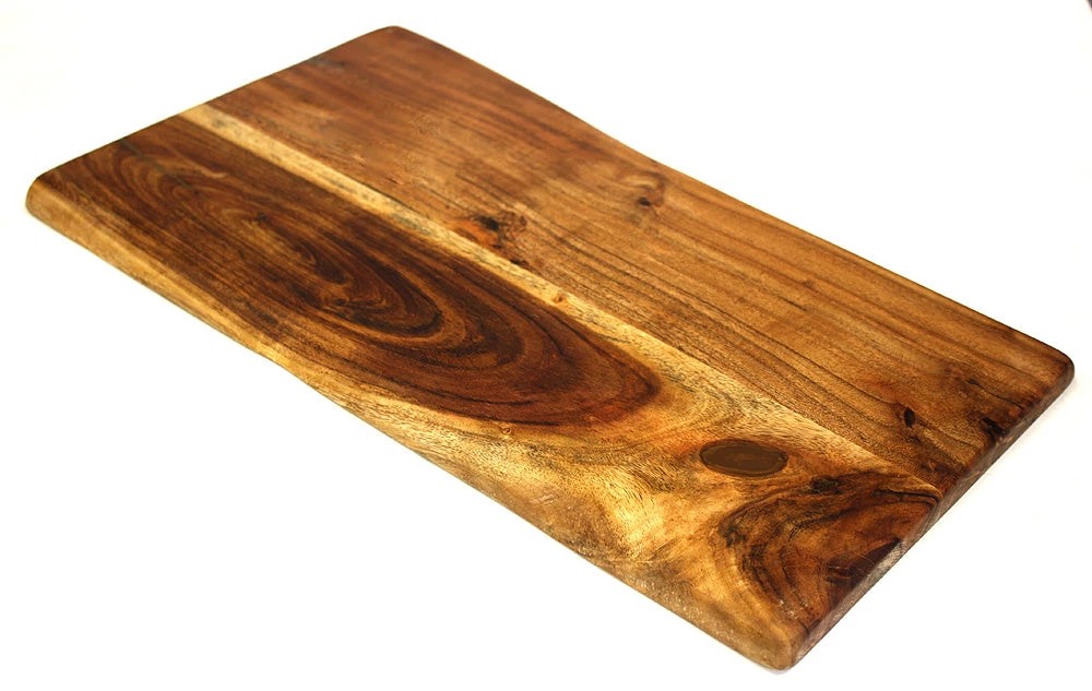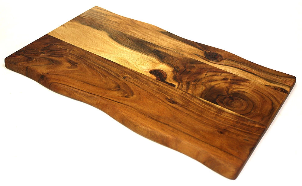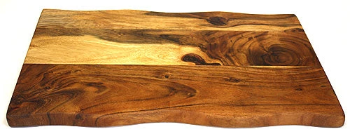 Dress up your kitchen or dining table with this durable, stylish and functional live-edge acacia wood cutting board or serving tray. Both sides of the board are suitable for chopping, slicing, or serving your favorite food. Your knife will require less sharpening because wooden cutting boards are less dulling than synthetic cutting boards. All of our cutting boards are protected with a food-safe natural oil finish.