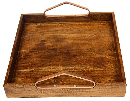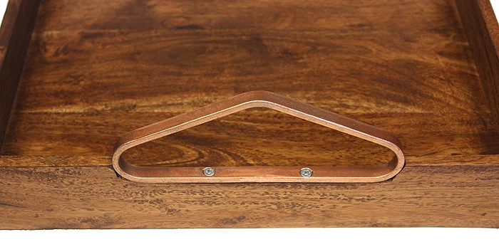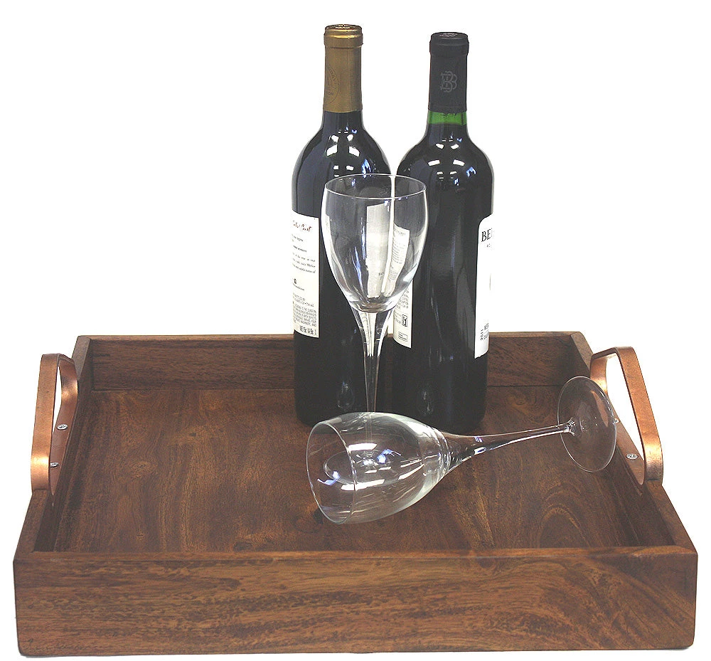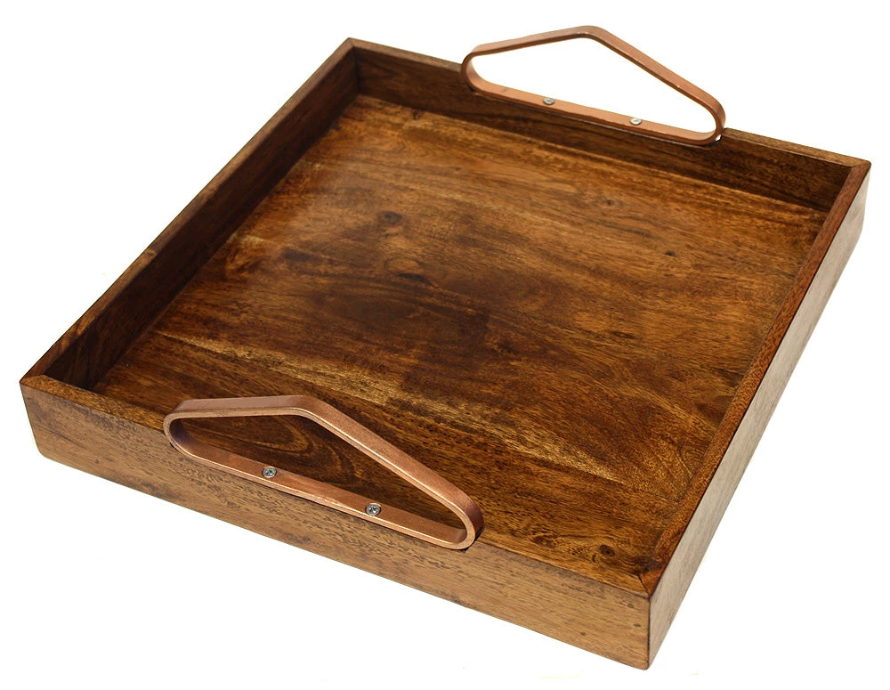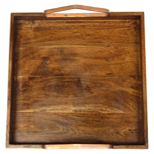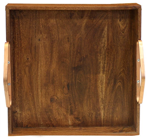 - The copper plated metal handles make this tray easy to carry and gracefully contrast with the handsomely varied acacia wood grain