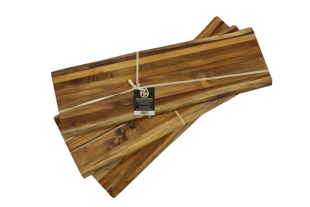 Dress up your kitchen or dining table with this durable, stylish and functional live-edge Teak wood cutting board or serving tray for kitchen. Both sides of the cutting board are suitable for chopping, slicing, or serving your favorite food. Your knife will require less sharpening because wooden cutting boards are less dulling than synthetic cutting boards. All of our wood cutting boards are protected with a food-safe natural oil finish.