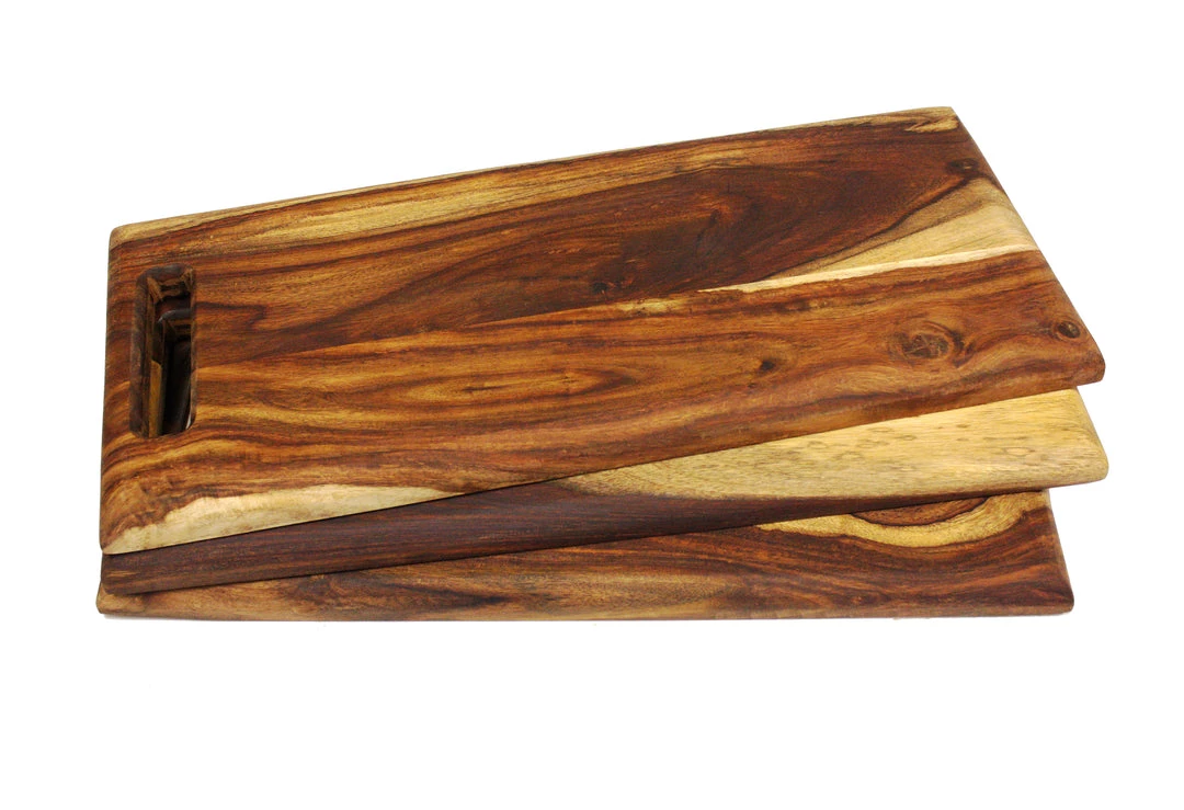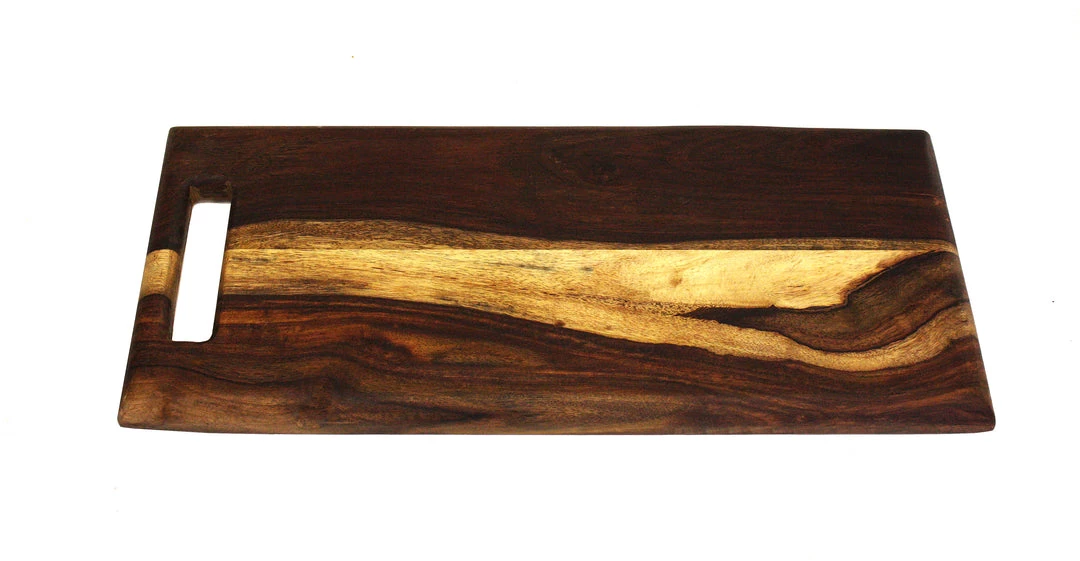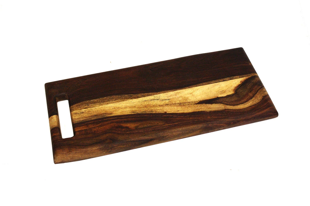 Made from beautiful edge-grain Sheesham; 22-inch cutting, carving, and prep station board by Mountain Woods. Richest hues of the wood combined with the most sophisticated wood grains provide a unique piece that combines function and magnificent artisanship, plantation-grown acacia wood is known for its versatility, function, beauty, and sustainability.