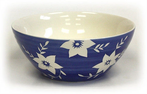 - Beautiful large ceramic serving bowl decorated with white blossoms on a deep blue background