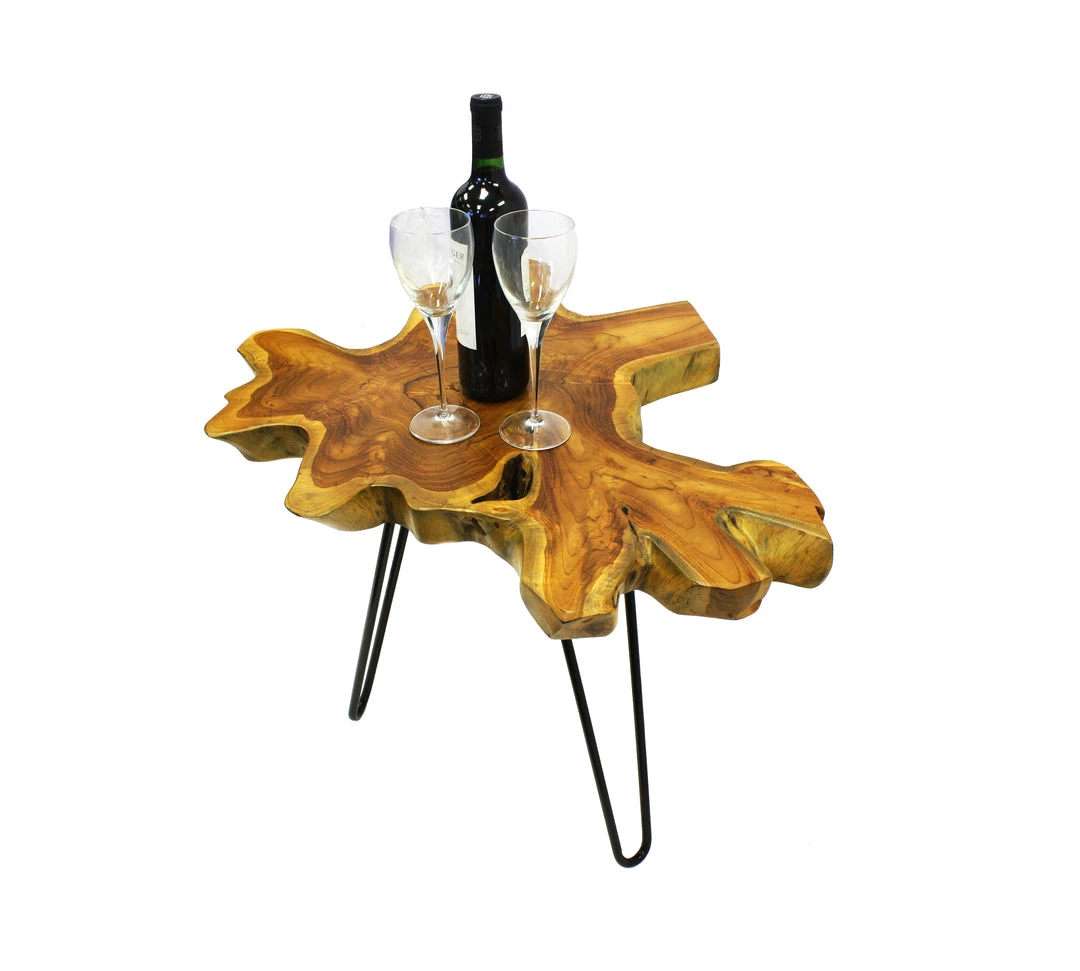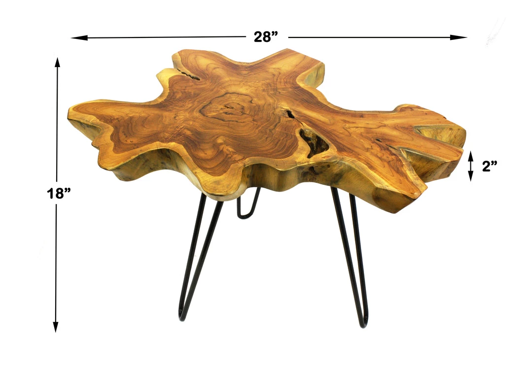 Made from beautiful and Organic Slab of Teak wood; 28 inch of surface side table by Mountain Woods. Richest hues of the wood combined with the most sophisticated wood grains provide a unique piece that combines function and magnificent artisanship, plantation-grown Teak Wood is known for its versatility, function, beauty, and sustainability.