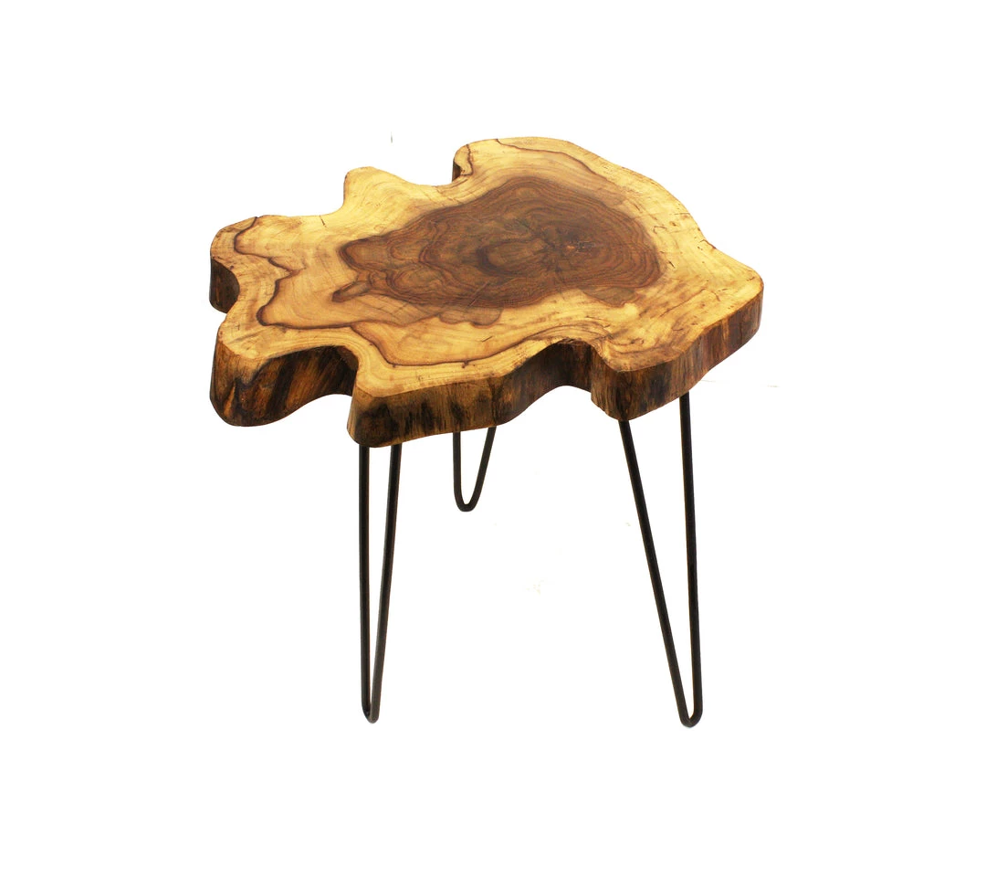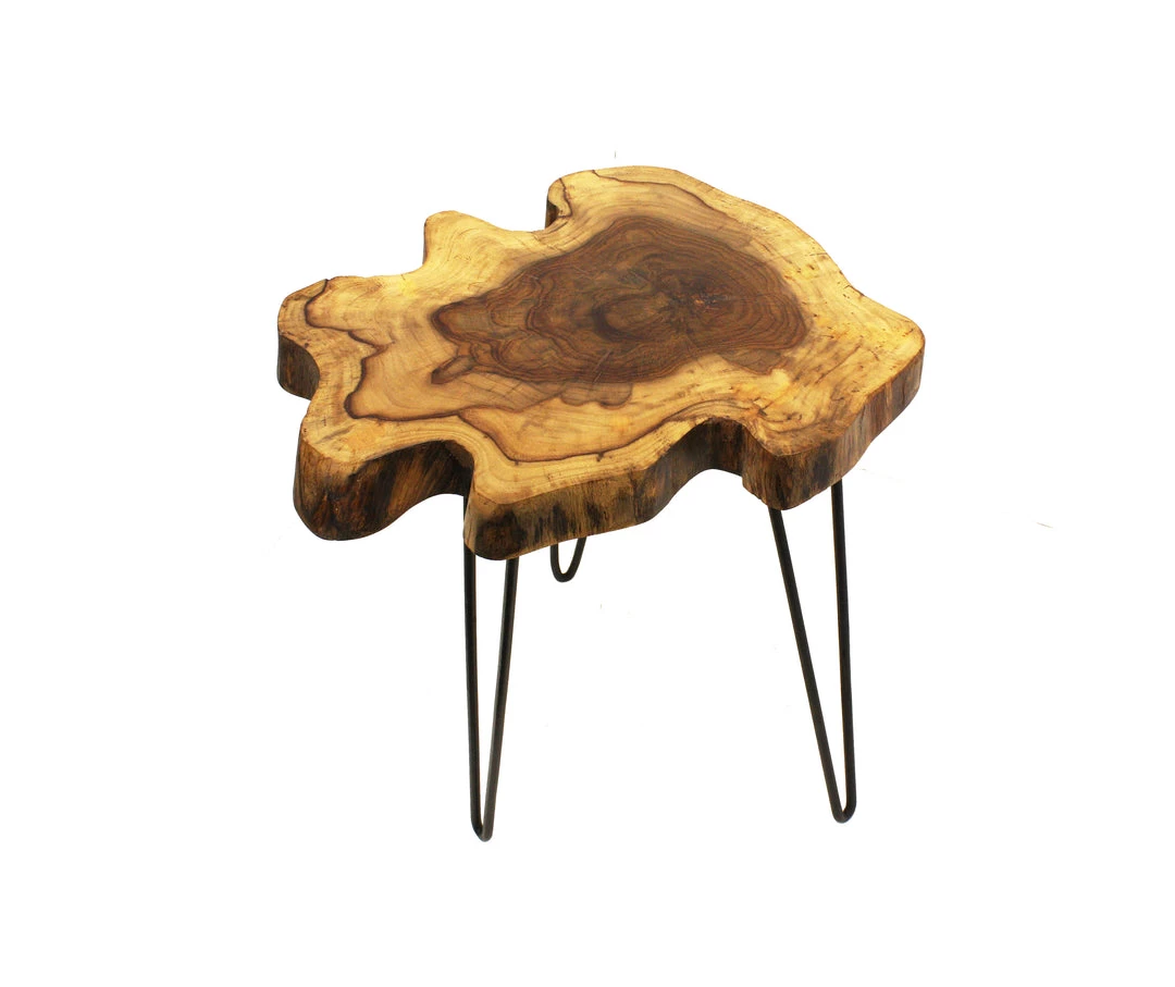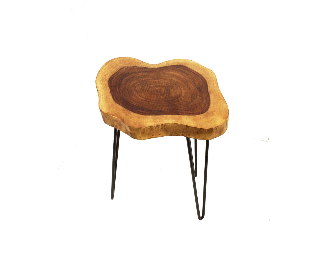 Made from beautiful Organic Slab of Acacia wood; 20-inch of surface side table or stool by Mountain Woods. Richest hues of the wood combined with the most sophisticated wood grains provide a unique piece that combines function and magnificent artisanship, plantation-grown acacia wood is known for its versatility, function, beauty, and sustainability.