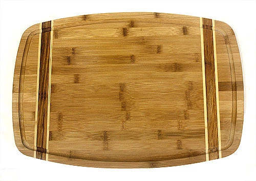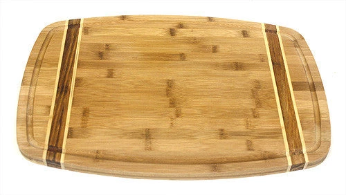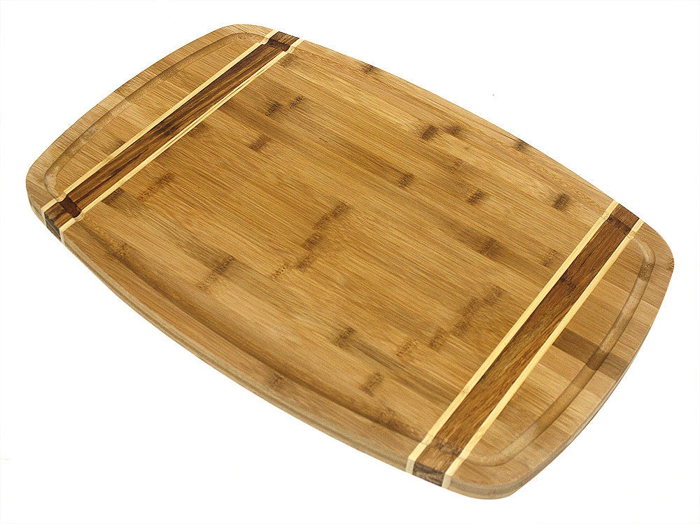 Protect your counter and table tops with this handsome bamboo cutting board that has three beautiful stripes on each end. Our bamboo cutting boards are made of durable, eco-friendly bamboo and feature a natural food-safe finish.