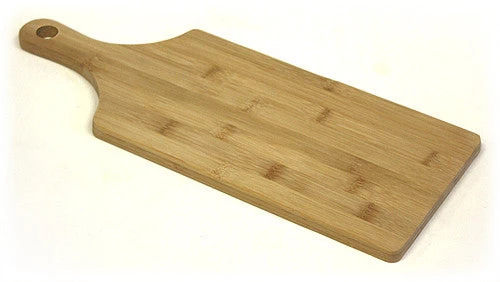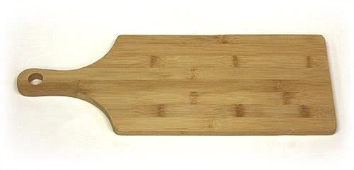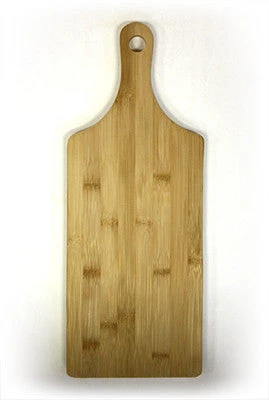 Protect your counter and table tops with this beautiful two-tone bamboo cutting board. This paddle-shaped cutting board also makes a great serving board for cheeses and other small appetizers. Our bamboo cutting boards are made of durable, eco-friendly bamboo and feature a natural food-safe finish.