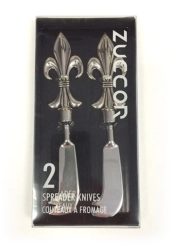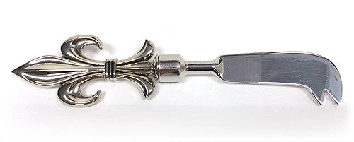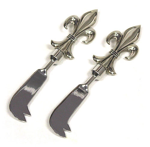Spread brie, camembert, mascarpone, boursault cheeses and more with this stylish pair of knives made of highly durable metal alloy. The handles of these finely crafted cheese spreaders are shaped like a fleur-de-lis, the French symbol for the flower of the lily.Β