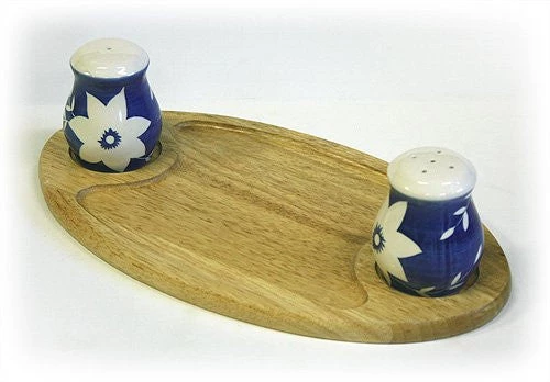 Great for serving up your favorite seasonings and condiments. Shakers are made from hand-painted, high-fired ceramics. A serving tray is carved from one piece of durable hardwood.