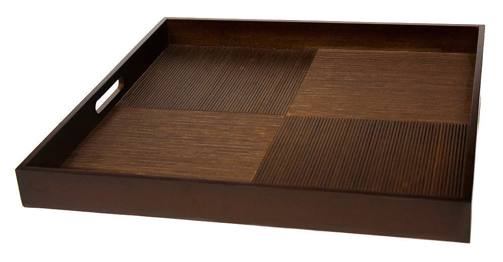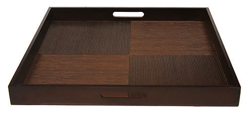 Serve in style with this beautiful bamboo serving tray featuring a rich, espresso brown color finish. This extra large tray is great for serving beverages on top of your ottoman, breakfast in bed, or appetizers in the dining room. The ribbed base of the tray is an attractive accent that inhibits items from sliding around. Two oblong handles skillfully cut out of the tray’s ends make it easy to pick up and carry. Made of strong, eco-friendly bamboo with a natural food safe finish.