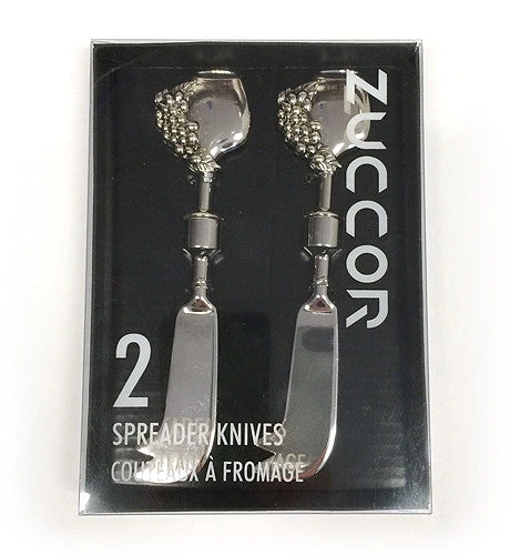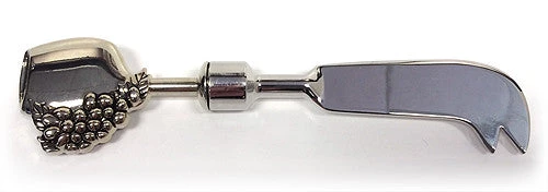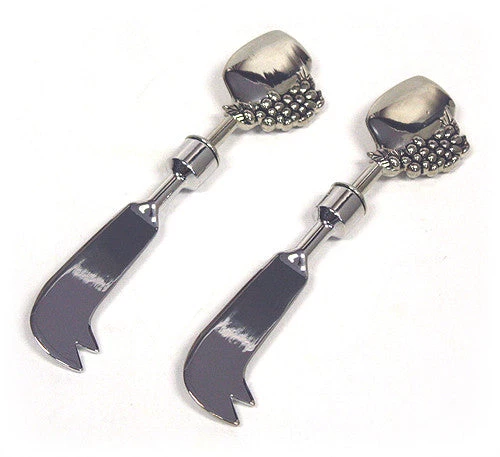 Spread brie, camembert, mascarpone, boursault cheeses and more with this stylish pair of knives made of highly durable metal alloy. The handles of these finely crafted cheese spreaders are shaped like miniature wine glasses and grapes.